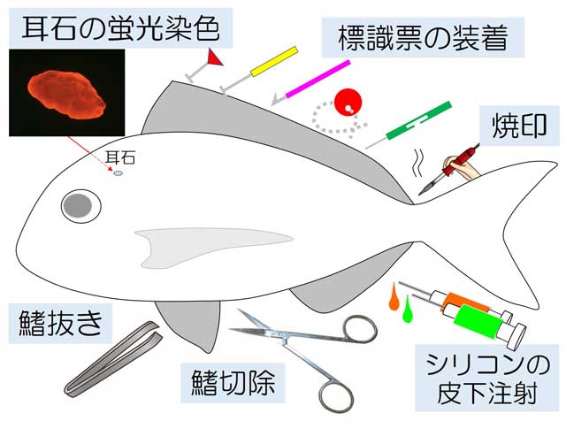 >資源回復を目的に放流された魚の一部には,調査のために「標識」と呼ばれる目印がつけられています。標識は捕獲された魚が「いつごろ」「どこで」「誰によって」放流された魚なのかを見分ける手段として重要な役割を担っています。標識にはタグと呼ばれる標識票を魚体へ装着したり,ハサミで胸鰭を切り取る,毛抜きで腹鰭を抜き取る,半田ゴテで体表の一部を焼く,色素を混ぜたシリコンを皮下注射する,頭の中の耳石(じせき)と呼ばれる硬組織を試薬で蛍光染色する方法などがあります。現状では,あらゆる調査に対応可能な標識は存在せず,目的に応じてこれらの標識を使い分ける必要があるため,新しい素材の探索と応用技術の開発が求められています。
