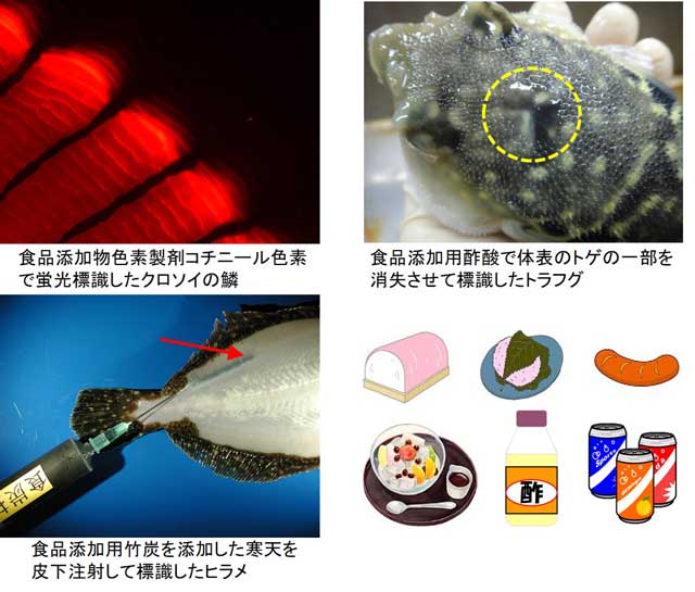 >近年は「食の安全」に対する国民の意識が高まり,標識についても放流魚の安全性がより一層担保される素材の探索が急務となっています。私たちは国内で着色を目的に使用されている食品添加物のうち,蒲鉾,菓子類,ソーセージ類など多くの食品に利用される天然由来の色素(コチニール色素)を用いてクロソイなどの鱗を蛍光標識することに成功しました。この他にも調味用,清涼飲料水に用いる食品添加用の有機酸でトラフグの体表のトゲを消失させて標識する手法,食品添加用竹炭と寒天をヒラメに皮下注射して標識する手法などを開発しており,更なる素材の探索と応用技術開発に取り組みます。