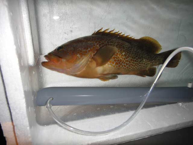 漁業者,養殖業者,市場関係者及び飲食業界からは水揚げされた魚の付加価値を高めるため,魚を殺さずに活魚の状態で都市部の市場へ輸送,販売する手法の開発が期待されています。私たちはキジハタ,オニオコゼ,シロギスなどを対象に安全でヒトにも魚にも優しい麻酔技術,安価で効率的な活魚輸送技術の開発に取り組んでいます。これまでにキジハタでは夏季の高水温期に特定の水温帯まで水温を下げると最長5時間にわたって麻酔できることを確認しています。今後は季節毎に適した水温条件,更なる長時間麻酔の可能性を検証し,実用規模での輸送試験を経て最適な麻酔技術,輸送技術に仕上げたいと思います。