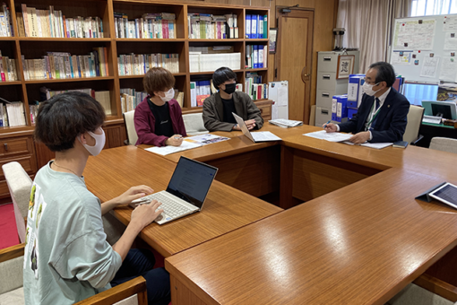 こんにちは、人間文化学部メディア・映像学科2年生の森山竜斗です。前回の学長室訪問(2021.5.19)から約5ヶ月が過ぎました。夏休みを挟んで、これまでに活動してきたことや進捗状況について改めて学長に紹介したいと思い、キャリアデザインゼミのリーダー藤本くん(心理学科2年生)、野上くん(心理学科2年生)と一緒に学長室を訪れました。