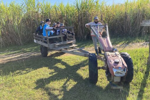サトウキビ畑は広大なので、専用車で移動しました。短い距離をゆっくりと移動するのですが、ガタガタと揺れる荷台に乗る経験は大変印象的だったと思います。それにしても、初日は大変天気が良く気持ちが良かったです。