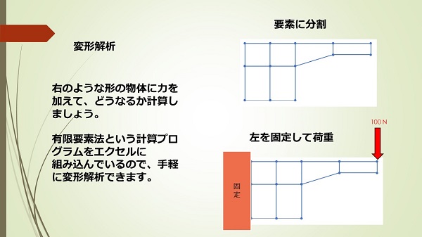 簡単な有限要素計算を行います。モデルを作って、荷重を加えて、どのように変形するかを見てみましょう。プログラムはエクセルに組み込まれていますので手軽に計算できます。