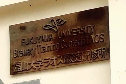 工場の壁には「福山大学ラオス醸造研修所」という看板がかかっています。この看板はとても立派なもので、一人で持ち上げるのがつらいほどの重さがあるそうです。