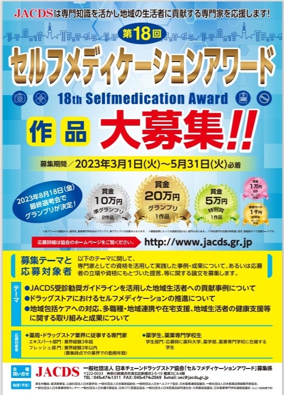 2023年8月18日~20日に開催された第23回JAPANドラッグストアショーにおいて、一般社団法人日本チェーンドラッグストア協会(JACDS)主催の第18回セルフメディケーションアワードの最終選考会が行われました。多くの応募の中から、薬学部6年生の西江智美さんと松本達也さんが執筆した論文が、それぞれ佳作に選ばれました。以下の内容は、薬学部の道原教授からの報告です。