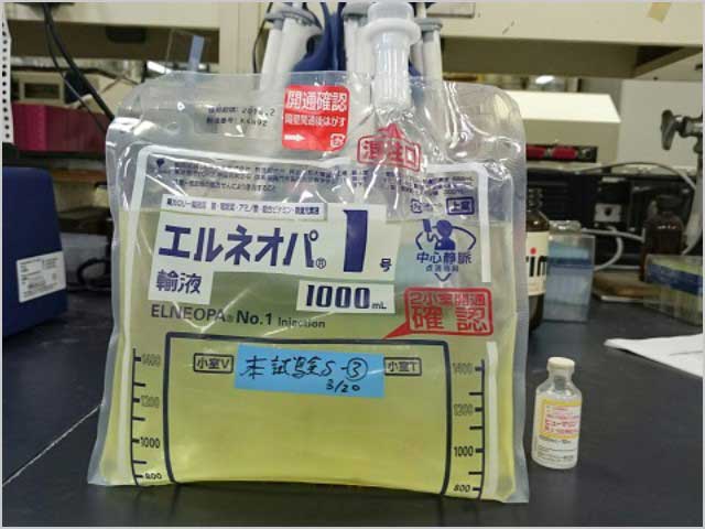 食べることができない患者さんでは、「高カロリー輸液」という1日に必要な糖分、アミノ酸、脂質、ビタミンなどが混合されている点滴を使用します。その中には、お薬を混ぜることが多いのですが、混ぜたお薬はいつまで安定に存在するのかよくわかっていません。そこで、薬局と協力してお薬の安定性を調べています。お薬の安定性がわかれば、薬剤師さんが何日分の点滴を作ることができるのか、患者さんのお宅に何日分の点滴を届けることができるのかわかります。