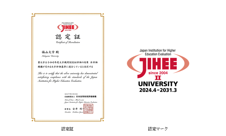 福山大学は、令和6年度大学機関別認証評価の結果、公益財団法人日本高等教育評価機構から大学評価基準に適合していると認定されました。