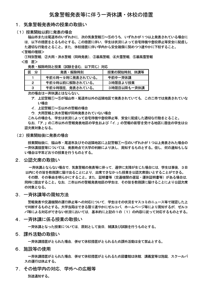 • 特別警報が福山市・尾道市以外の近隣地区で発表されていても,この2市では発表されていない場合は、休講とはなりません。ただし、この2市では特別警報が発表されていなくても、学生の登校に危険があると本学が判断した場合には上記の休講措置をとることがあります。
