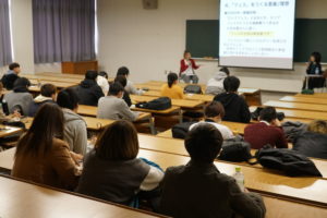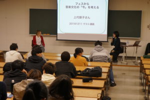 私が担当する「情報社会とコミュニケーション」という授業の中で「フェスから音楽文化の“今”を考える」と題し、音楽フェスの制作に携わってきた上代朋子さんをお招きしてのゲスト講義を開催しました。(メディア・映像学科 阿部)