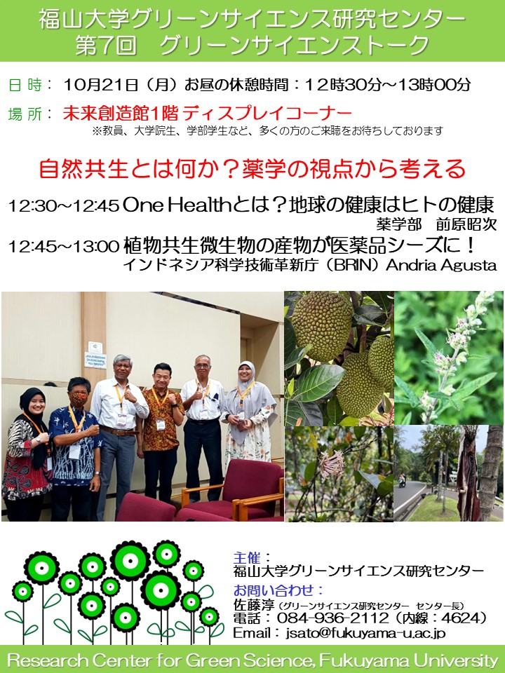 次は10月21日(月)12時30分からです!薬学部の前原准教授がワン・ヘルスの研究プロジェクトについて、そしてインドネシアから来日中のアンドリア・アグスタ博士には植物共生微生物が産生する医薬品についてトークします。次回も楽しみなトークです。みなさん、ぜひいらしてください。