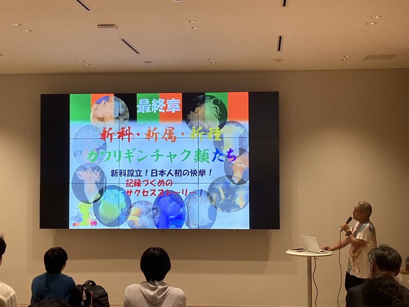 泉貴人講師からは、同じく7月に刊行した「なぜテンプライソギンチャクなのか?」について、さらに勢いのあるトークがさく裂しました。小気味の良いテンポのトークで、まるで落語を聞いているようでした。ギャグ、自虐、自慢が満載で、それでいて悪い印象を与えない圧倒的な知と、海の生物多様性の面白さを感じさせてくれる多様なクラゲたちの写真がとっても印象的でした(こちらも参考に)。楽しく学べそうですね。