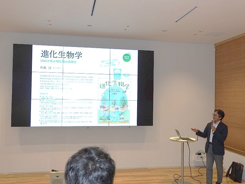 わたくし佐藤の方からは、今年7月に刊行した「進化生物学~DNAで学ぶ哺乳類の多様性~」の流れにそって、福山大学で20年以上展開してきた研究について15分でまとめて話しました。瀬戸内海の島々との出会いと島のネズミの進化の話から、学生が頑張って明らかにしたレッサーパンダの進化的由来、アザラシやアシカの味覚の退化の話、そして「なぜ進化生物学を学ばなければならないのか?」についてざざ~っとしゃべり倒しました。とても15分では話しきれませんでしたが、来られたみなさまに何かが届いていたら幸いです(こちらも参考に