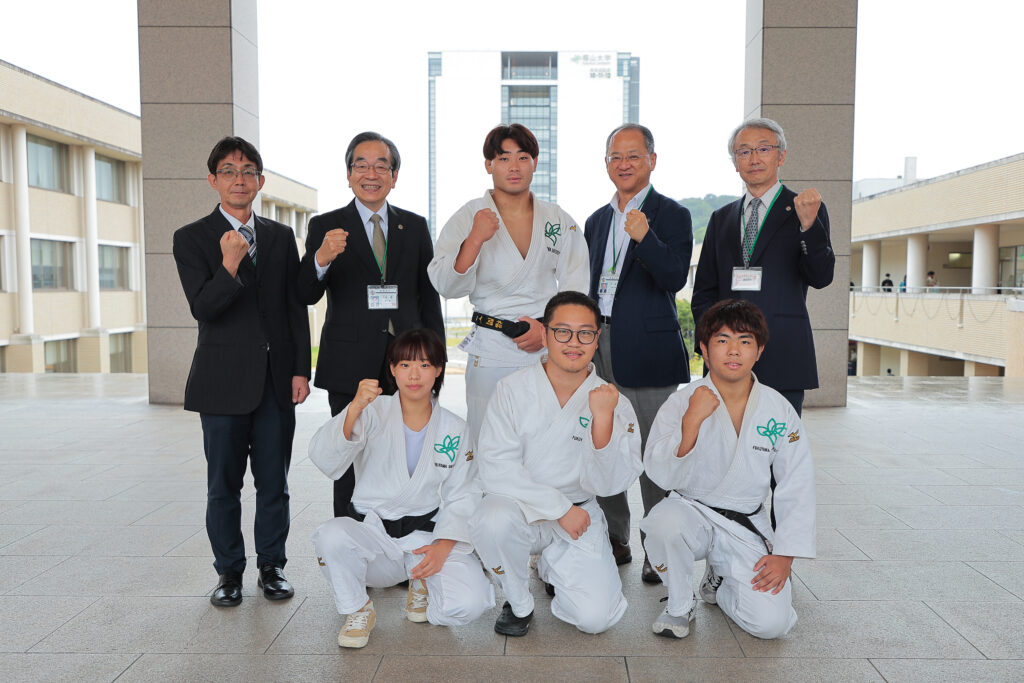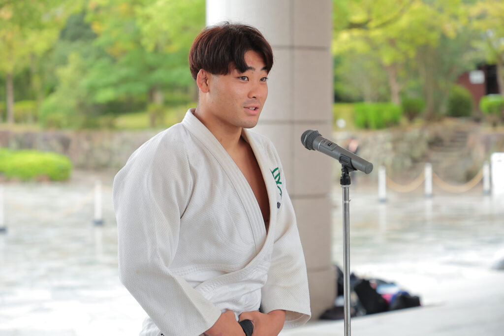 全国大会2日前に遡りますが、10月3日(木)のお昼休みに学内で壮行式を執り行いました。大塚学長をはじめ多くの教職員と学生が参列し、福間さんと柔道部員に向けてエールが送られました。