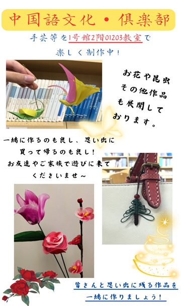 今回の中国文化に関連する展示と手芸品製作は、中国語文化倶楽部において二回目の催しでした。訪れたたくさんの方々に喜んでいただき、クラブ活動がより充実した内容といえる思い出になりました。