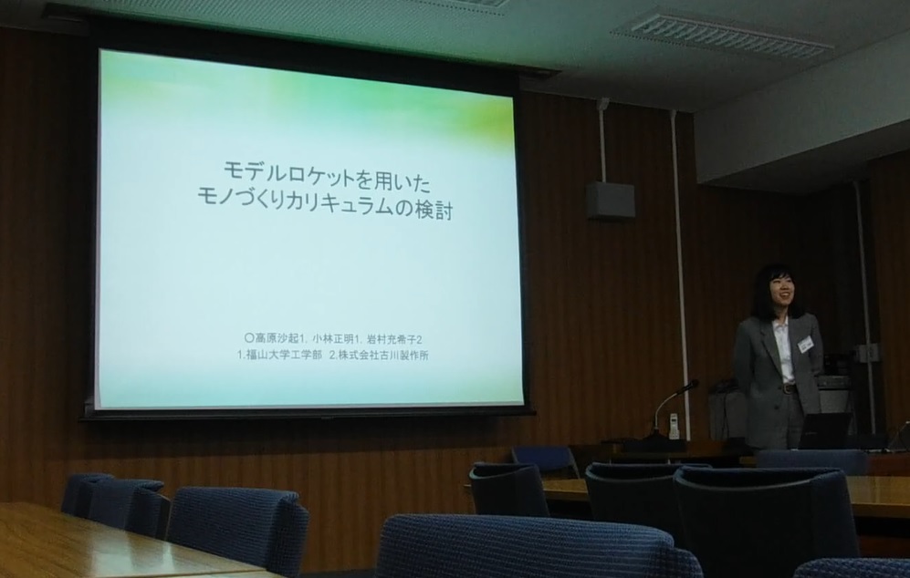 発表の表題は「モデルロケットを用いたモノづくりカリキュラムの検討」で、小中学生の理科離れ対策としてモデルロケット製作の学習カリキュラムを検討した結果について発表しました。このカリキュラムのポイントは、学習者が重心位置や圧力中心の位置をどこにすればいいのかなどを考えながら、自分達で工夫できるようにした教材用のモデルロケットを用いるということです。楽しみながら知らず知らずのうちにロケット工学の基礎が身につく仕掛けになっています。