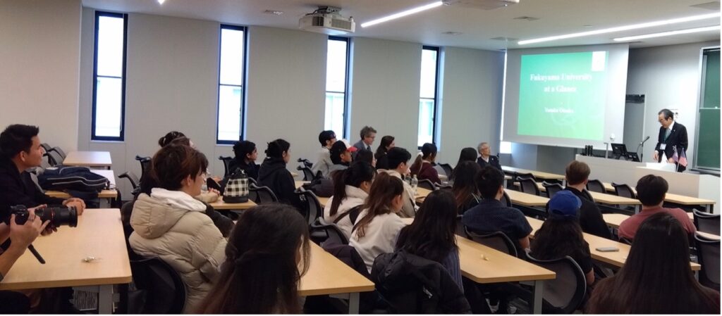 After the Americans arrived at Haneda on December 12th, they flew to Hiroshima Airport on the morning of Friday the 13th and bused to Fukuyama. Students from the Faculties of Economics, Human Culture, and Engineering greeted the visitors on Campus. After the visitors ate lunch, FU students briefly welcomed them in an informal chat session on the 11th floor of the Future Creation Building. They then guided them to the big “fishbowl” classroom on the second floor where Fukuyama University President Otsuka officially welcomed them with a short but heartfelt speech. The students then took the visitors on a walking tour on campus where they met Fuku and Dai, our campus weed control crew. They were also very impressed by the FUKURIN picture on the banners on the side of Building 1.