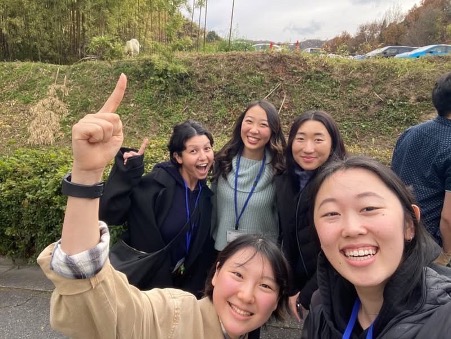 その後、学生たちは訪問者をキャンパスツアーに案内し、大学の除草隊「フク」と「ダイ」にも出会いました。さらに、1号館の側面に掲げられた「フクリン」のバナーの写真にも感心していました。