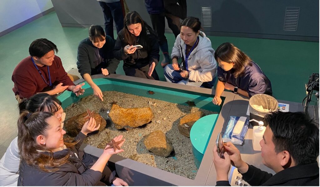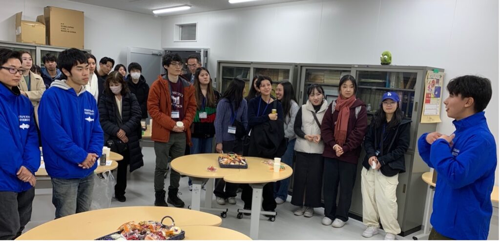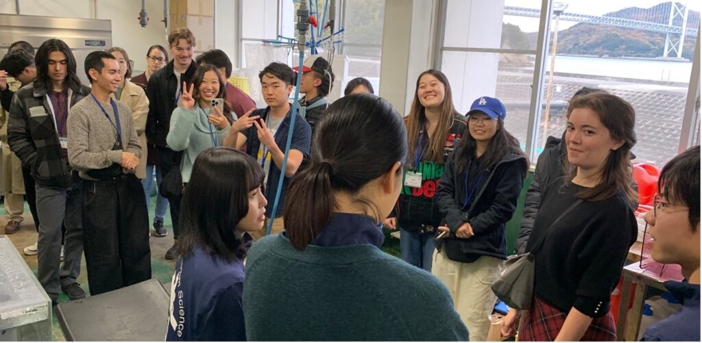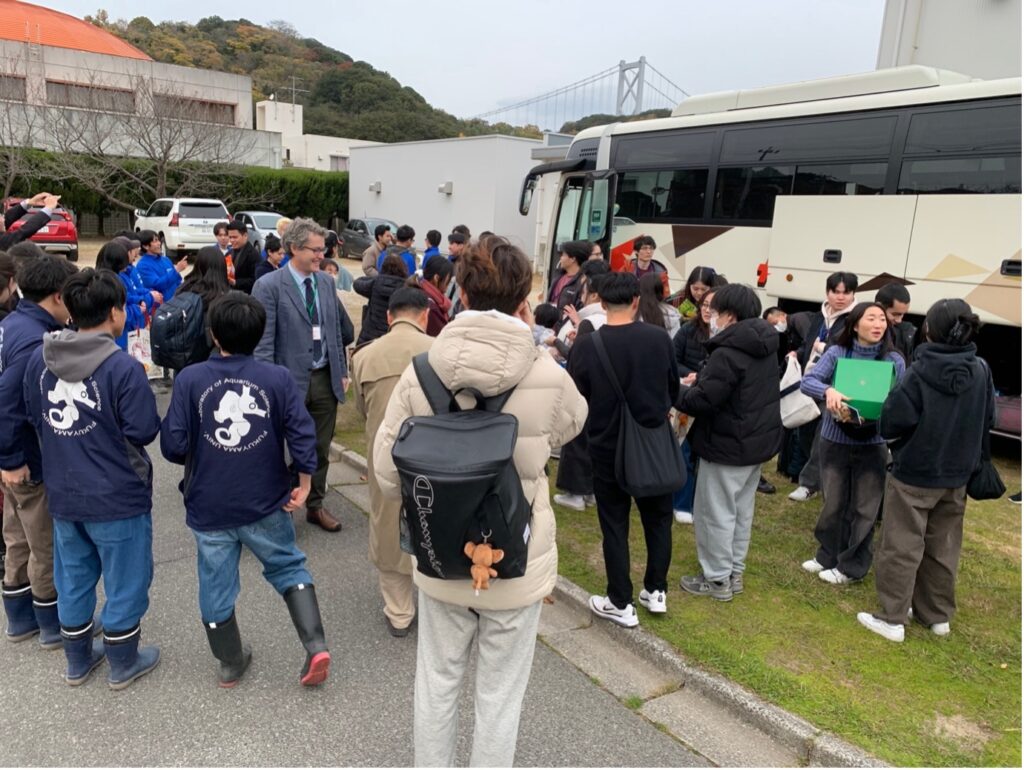 キャンパスツアー終了後、訪問者、福山大学の学生たち、そして数名の教職員は、しまなみ海道を渡り、福山大学マリンバイオセンター水族館に向かいました。生命工学部海洋生物科学科の学生たちが水族館と自分たちの研究内容について説明するツアーを行いました。海洋生物科学科の学生たちは訪問者に英語で説明を行い、質問にも丁寧に答えていました。