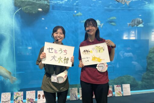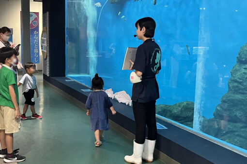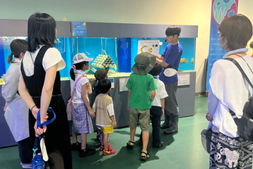 今年度の夏休み期間には、マリンバイオセンター水族館で展示生物を紹介する「生き物ポイントガイド」を実施し、多くの来館者に向けて解説を経験しました。