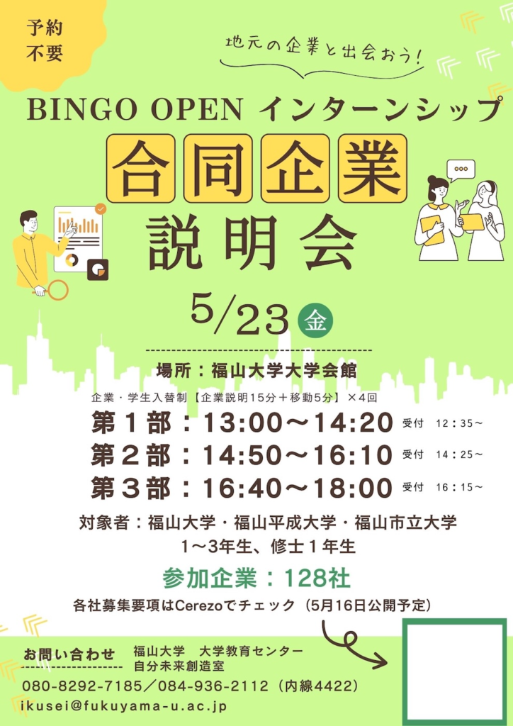 2025年5月23日(金)福山大学大学会館にて、令和7年度「BINGO OPENインターンシップ合同企業説明会」を開催しました。本説明会は、学生と受け入れ協力企業とのマッチングを目的としたもので、今年度は過去最多となる128社の企業にご参加いただき、延べ579名の学生が参加しました。これは昨年度の106社・382名を大きく上回る成果となりました。