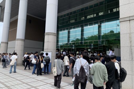 開始前、会場の大学会館の前にぞくぞくと集まる学生たち