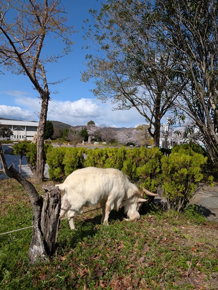 キャンパスが広くて緑が多いことが印象的です。赴任した4月は桜が満開で美しく、その後もツツジや藤の花が咲き、新緑も鮮やかで、毎日キャンパスの中を歩くのが楽しみになっています。中でも一番の楽しみは、雑草を食べるためにあちこちに出現するヤギの「ふくちゃん」と「だいちゃん」に出会えることです。逢うたびに声をかけているので、どうやら「ふくちゃん」は私のことを覚えてくれたようです。