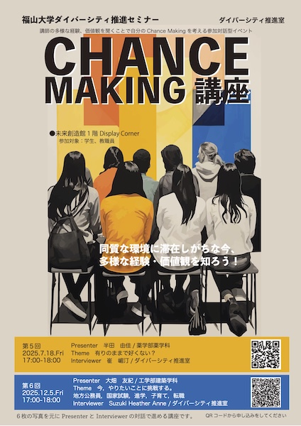 ダイバーシティ推進室では、多様な価値観や経験に触れる機会を増やすために「Chance Making講座」を開催しています。これは、大学生活の中では学部や学科の同質な環境に留まりがちで多様性に触れる機会や情報が少ないことから、多様な価値観や経験を持つ人の経験を聞くことで、自分の可能性を広げるきっかけとしてもらおうと企画した講座です。