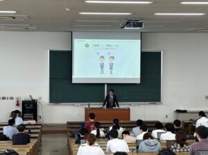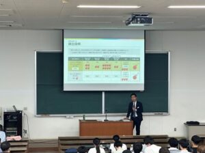 続いて、株式会社三井住友銀行尾道支店の濱支店長より、「将来に備えるお金の話」と題して、将来的に想定される支出と、それに備えるための貯蓄・投資の考え方についてご講演いただきました。投資にはリスクが伴うもので、それと上手に付き合うためには「長期・分散・積立」が重要であるとの説明があり、学生にとって実践的な学びとなりました。また、聴衆を引き込む話し方についても学生は学ぶところが多かったことでしょう。