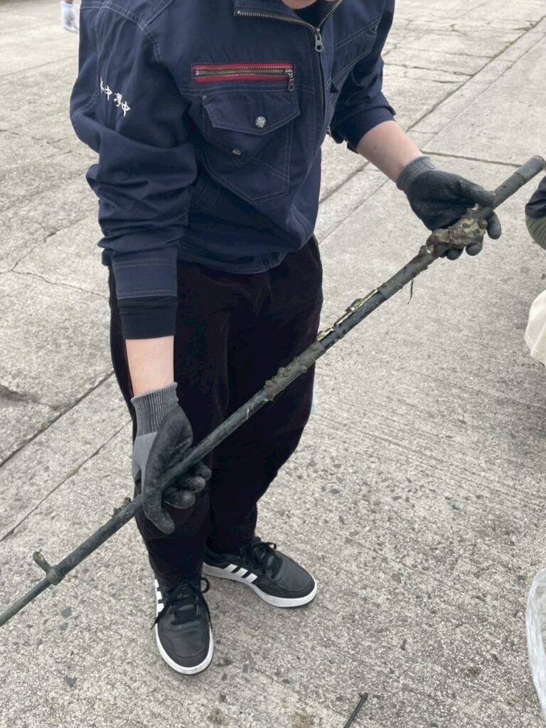 今回の清掃活動では、なんと90L容量のごみ袋17袋分ものゴミを拾うことができました! とくに、缶やロープ、木材などが多く見られました。また、通常のゴミに加えて、釣り竿やガラケー、さらにはバイクも見つかりました。