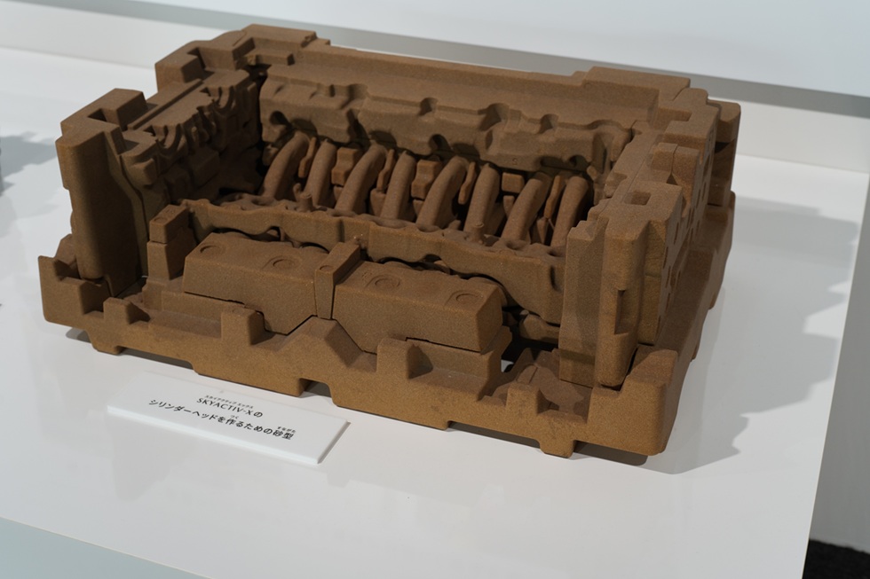 機械工学者の目線から興味深かったのは、エンジンシリンダーヘッド鋳造に用いられる砂型が展示されていたことです。以前は手作業での作成でしたが、今は3Dプリント技術で精密に作成できる技術が開発され、マツダではすでに導入済みということがわかります。