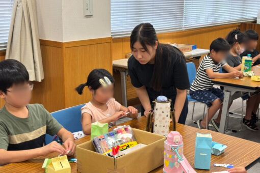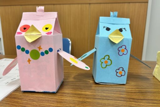 工作教室では、牛乳パックで「とりの貯金箱」を作成します。お金を入れると鳥の羽がパタパタと動く仕掛け付きです。事前打ち合わせの際に、学生も実際の手順通りに作成させていただきました。子どもたちが作りやすいようにするための工夫を考え、「貯金箱の上の部分をホッチキス止めすると作りやすいかも」というアイデアを出し合う姿が印象的でした。この時に作成した貯金箱は、イベント当日に子どもたちへの見本として使用しました。