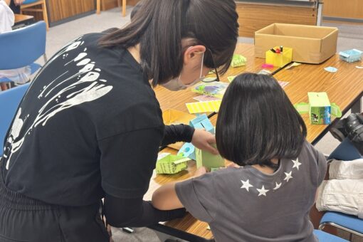 工作教室では、それぞれ1つの机につき、子どもたちの工作のサポートをしました。子どもたちは仕組みを予想し、ワクワクしながら作成をしていました。シールやペンで鳥の顔や模様などを描き、個性豊かな鳥たちが誕生していました。