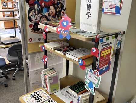 「万博開催記念」の展示を、大阪万博開催中に実施しました。2025年大阪・関西万博のテーマである「いのち輝く未来のデザイン」を中心に、SDGsやSociety5.0に関する本を集めました。また、過去に開催された日本万国博覧会に関する本も展示し、万博について知ってもらう良い展示となりました。中でも、SDGsに関する資料の貸出が多く、関心が高まっていることを感じました。