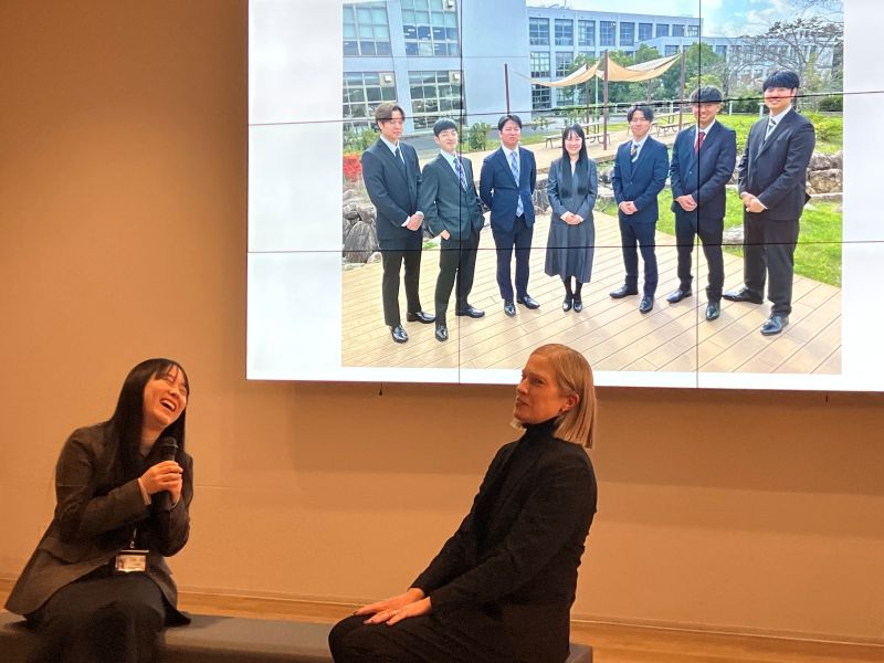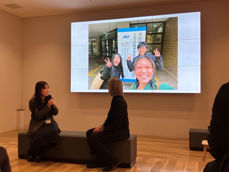 第6回は2025年12月5日(金)に、未来創造館1階のDisplay Cornerで開催しました。講座は、プレゼンターとインタビュアーの会話形式で行われます。今回のプレゼンターは、工学部建築学科の大畑友紀講師、インタビュアーは大学教育センターのSuzuki Heather Anne助教です。テーマは「今、やりたいことに挑戦する。地方公務員、国家試験、進学、子育て、転職」として、大畑講師の驚くほどアクティブな取り組みが紹介されました。