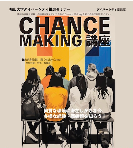ダイバーシティ推進室では、多様な価値観や経験に触れる機会を増やすために「Chance Making講座」を開催しています。これは、大学生活の中では学部や学科の同質な環境に留まりがちで多様性に触れる機会や情報が少ないことから、多様な価値観や経験を持つ人の経験を聞くことで、自分の可能性を広げるきっかけとしてもらおうと企画した講座です。