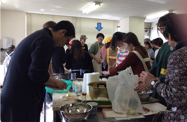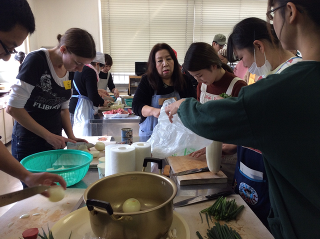 早速、11時から調理を開始し、料理の大先輩や市民の方にリードされながら留学生と日本人学生は共同作業で頑張りました。