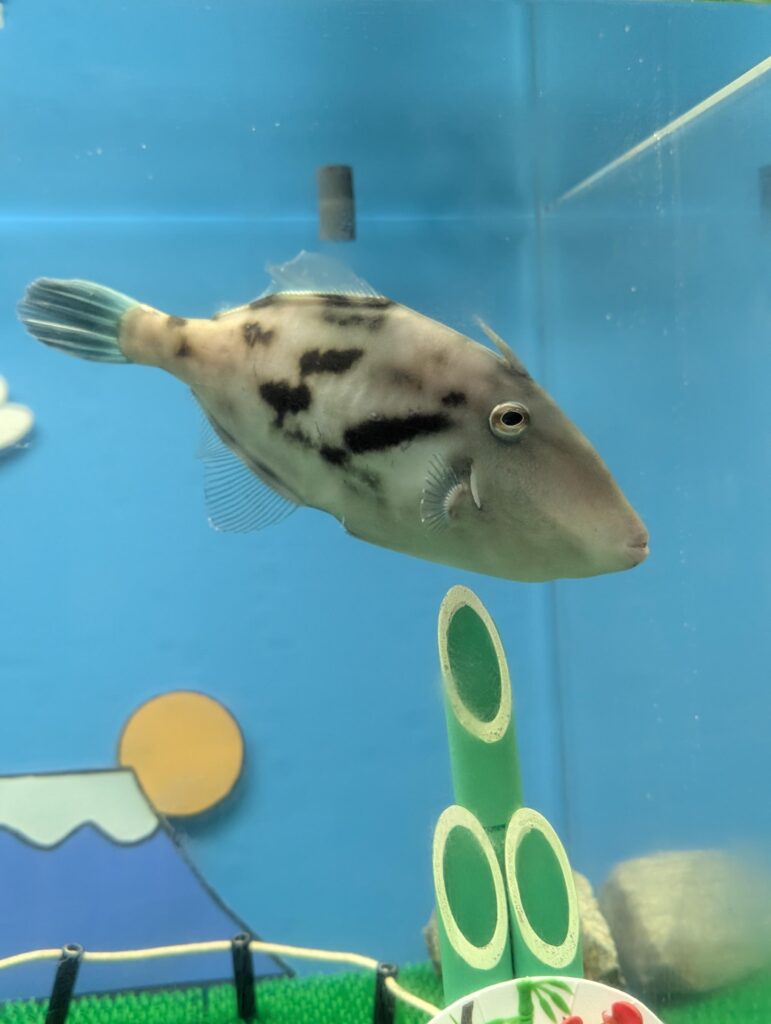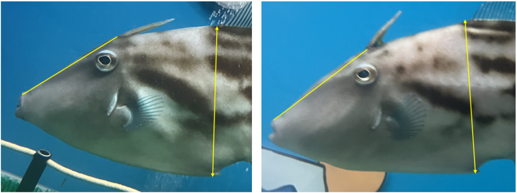 ウマヅラハギはその名前の通り、顔が面長で馬のように見えることから今回のレースに出走が決まりました! ウマヅラハギには馬のたてがみのようにも見える硬い棘を備えた立派な背鰭があり、岩の隙間に体を固定するときに使用したり、捕食者から身を守ったりする役割があります。外観から雌雄の区別ができるとされていて、背鰭から口先にかけての頭部が雌ではほぼ直線状にまっすぐなのに対して、雄はやや膨らみます。また、「体高」と呼ばれる体の高さでも見分けることができ、体高が全長の42%以下だと雄で、44%以上だと雌・・・つまり体高が比較的低い個体は雄ということになります。今回はこれらの特徴を踏まえて雌雄1個体ずつ選出していますので、ぜひ見比べてください。また、鰭を動かす筋肉としてはたらく血合筋は雄のほうが発達していることから、より高い遊泳持久力があると考えられています。泳ぎの違いも見てみると面白いかもしれませんね!