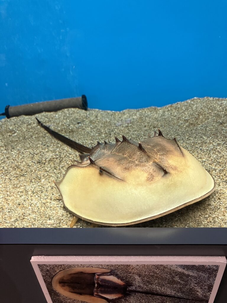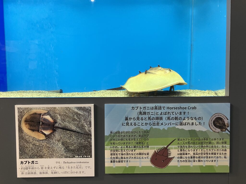カブトガニの英名はHorseshoe Crabで、今回のレースに出走が決まりました! 西洋では魔除けや幸運のお守りにもなると信じられてきた馬蹄(Horseshoe)とカブトガニの甲の形が似ていることが英名の由来です。展示している個体は尾道漁業協同組合の漁業者の方の網にかかったものを、傷をつけないように網を切りながら丁寧に外していただいた後、多くの方にご覧いただきたいとの思いから、当館に寄贈いただいたものです!