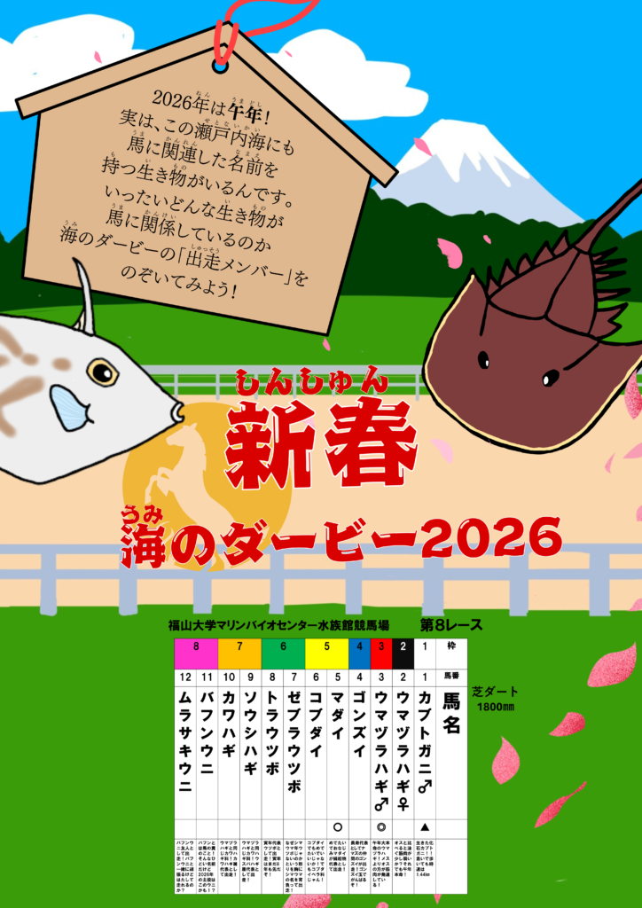 学長から一言:因島キャンパスの附属水族館では、お正月にふさわしい恒例の特別水槽を設け、午年(うまどし)に因んで、馬の蹄を意味する英語名を持つカブトガニ、そしてウマヅラハギを展示。「新春 海のダービー2026」のタイトルの下、競馬の雰囲気も採り入れた、なかなかの趣向を凝らした展示で、きっと来館者の興味・関心を惹くこと間違いなしです。