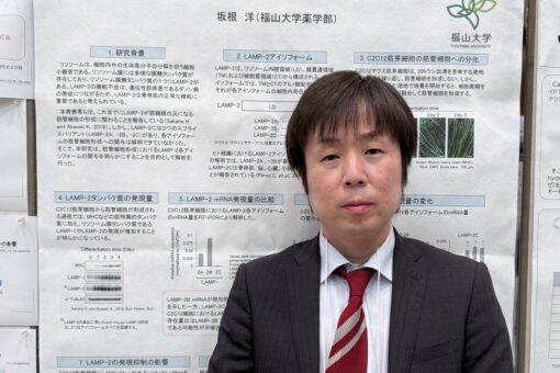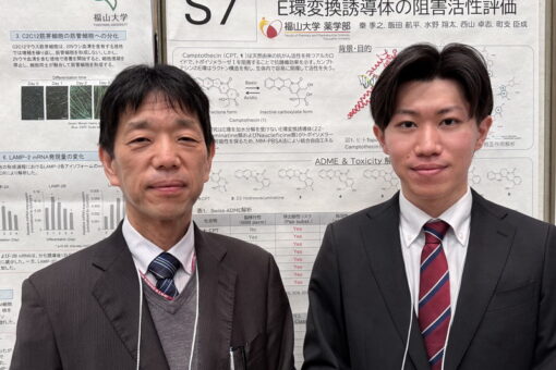 福山大学からは、薬学部大学院薬学研究科2年の要田恒希さん・竹田修三教授、坂根洋准教授、薬学科5年の飯田航平さん・秦季之教授による3件のポスター発表が行われました。また、このうち要田恒希さんが舞台発表も行いました。