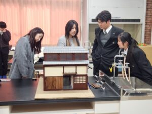 今回の授業テーマは、大学生と高校生が一緒になり3次元CADと3Dプリンタで備後絣の織元工場をジオラマで再現していくというものでした。大学生たちは、工場の見学、織機の計測などしっかり準備をして資料を作っていました。大学生、高校生共によい経験になったと思います。