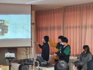 次は3年生の右佐林さん、小林さん、森本さんによるシャトル織機のデータ化についてです。福山工業高校には約100年前の古いシャトル織機があります。このシャトル織機をどのようにデータ化していくのか、シャトル織機の特長や機構を残しながらデータ化していく方法などを説明しました。