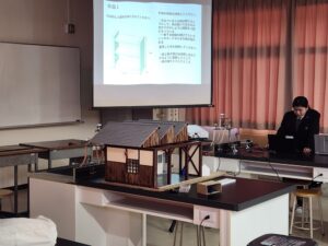 まずは、1年生の青木さんから織元工場をどのようにデータ化しジオラマを制作していったかについて、データ化の方法や3Dプリンタの活用方法などを説明しました。