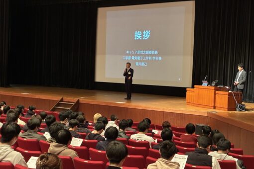 はじめに、福山大学キャリア形成支援委員長の香川直己教授(工学部 電気電子工学科)より挨拶がありました。