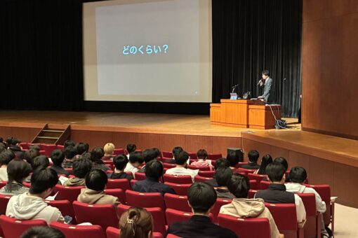 学生に問いかけながら進めるアクティブラーニングのスタイルで、インターンシップ参加率の高まりや、就職環境の変化について紹介しました。現在は多くの大学生が就業体験やインターンシップに参加する時代となっており、「就職できること」と「自分が納得できる会社を選べること」は別であるという点が強調されました。また、自分に合う企業を見つけるには、情報だけで判断するのではなく、実際に見て、聞いて、感じることが欠かせないことを、身近な例えも交えながらわかりやすく説明しました。