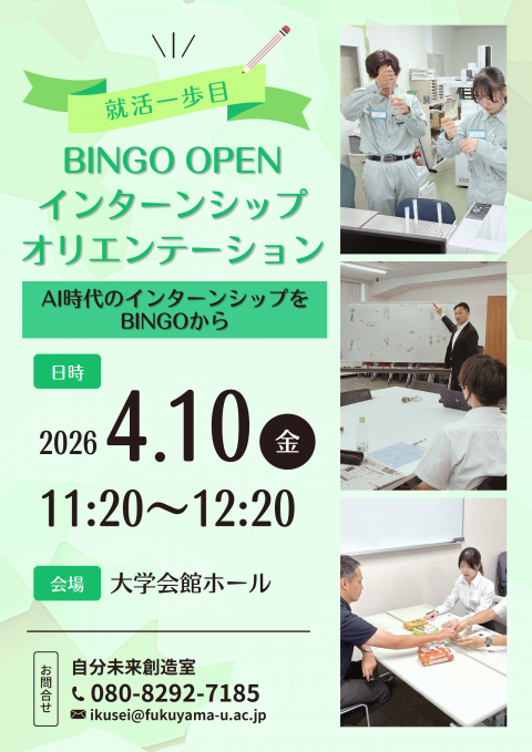2026年4月10日(金)、福山大学大学会館にて「BINGO OPEN インターンシップ2026 オリエンテーション」を開催しました。