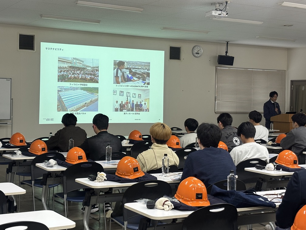 福山大学からバスで約30分、現地に到着後、まずは会社説明をしていただきました。造船業を取り巻く環境や事業内容、今後の展望についてのお話があり、また、普段なかなか触れることのない「世界レベルの造船」の話に、学生たちは興味津々の様子でした。