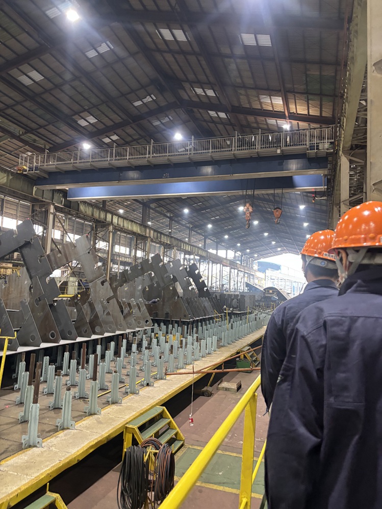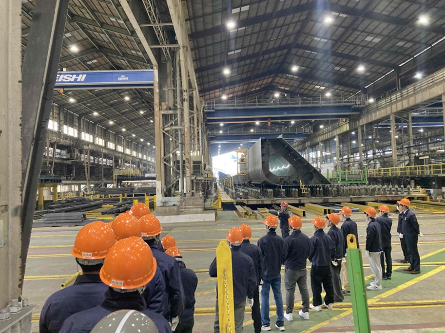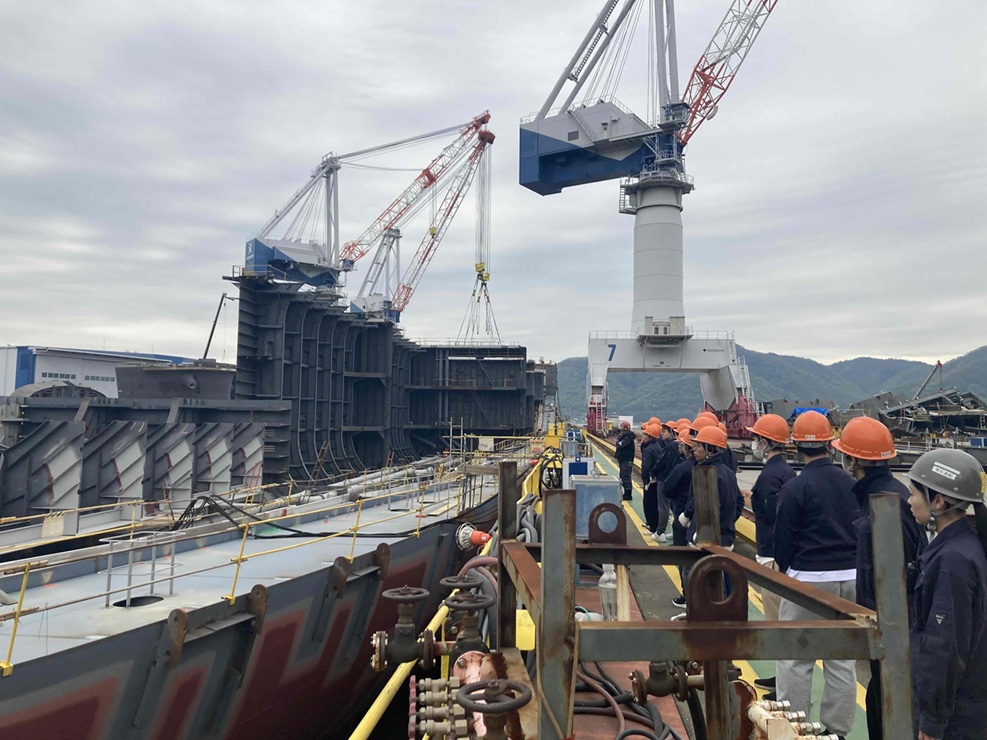 その後は、安全装備(作業服・ヘルメット・無線イヤホン)を身に着け、いよいよ工場へ。広大な敷地の中で、鉄板が巨大な船へと形を変えていく工程を間近で見学しました。普段の授業では見ることのできないスケールの大きなものづくりに、学生たちは圧倒されていました。