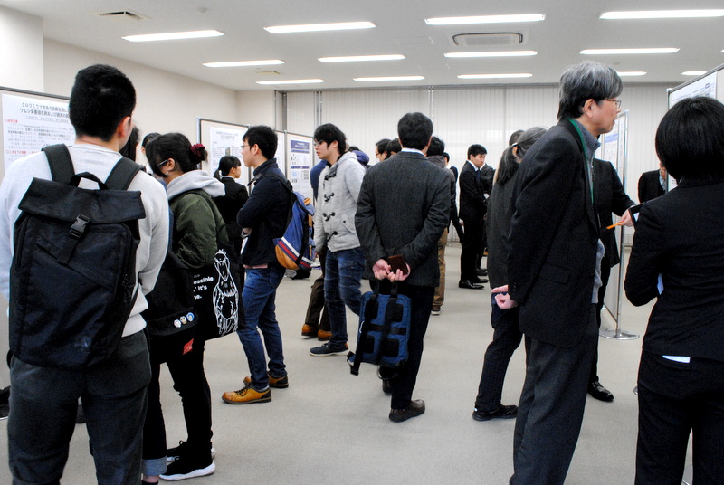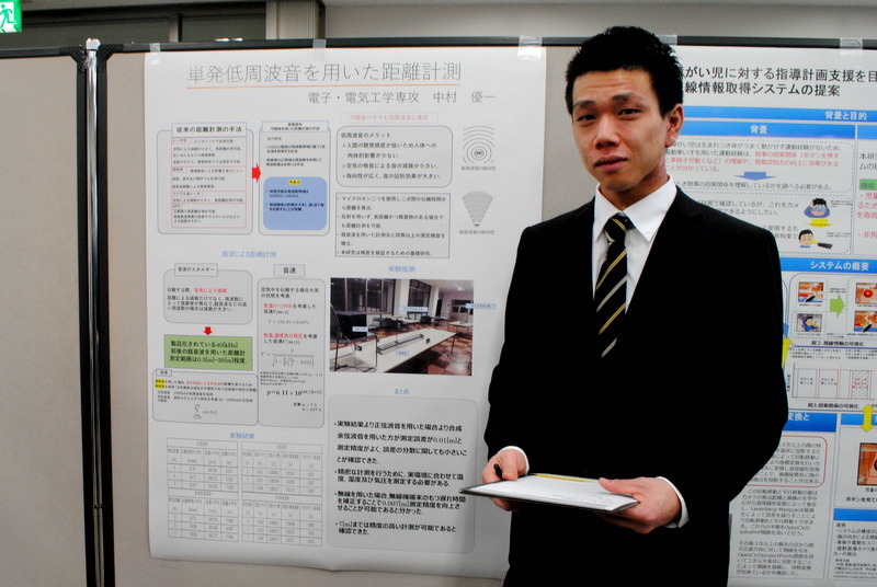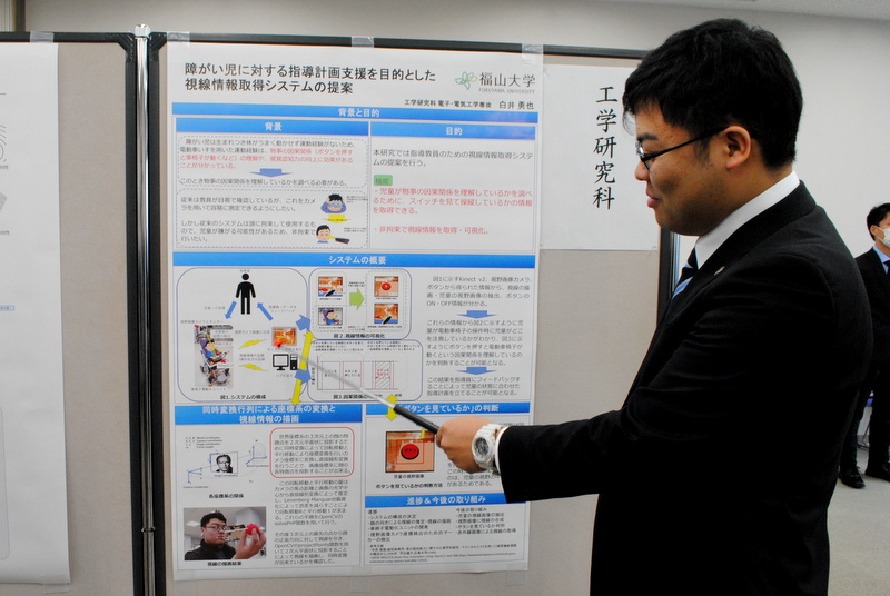 工学研究科の電子・電気工学専攻からは、中村優一さんの「単発低周波音を用いた距離計画」、白井勇也さんの「障がい児に対する指導計画支援を目的とした視線情報システムの提案」のポスター発表がありました。中村さんと白井さんは、昨年の中国支部学術講演会での学会発表からもう一段研究を進めて、発表ポスターに研究をよくまとめていました。また、情報処理工学専攻からは、横山大知さんの「アクティブ・ラーニング環境における非接触性操作の即応性評価」の発表がありました。