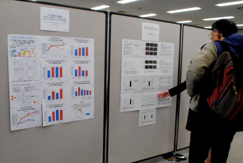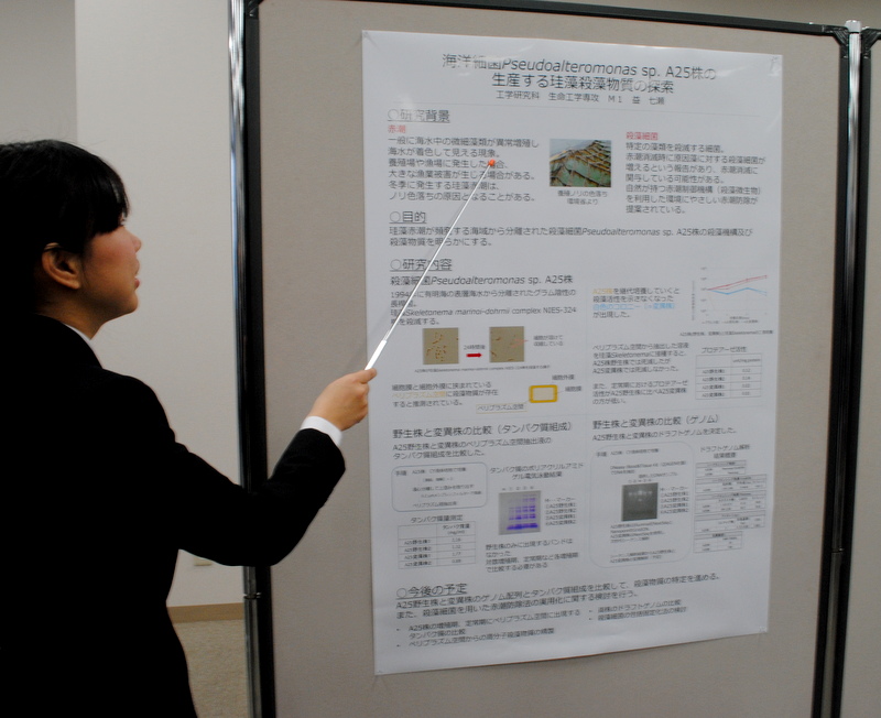 工学研究科の生命工学専攻からは、「クラゲ類の雌雄特異的な形態的・分子的マーカの探索と同定」、「紅藻スサビノリのLEA様タンパク質の解析」、「海洋細菌 Pseudoalteromonas sp.A25株の生産する珪藻殺藻物質の探索」、「クロウミウマ稚魚の初期生残に及ぼすワムシ栄養強化剤および親魚の餌の影響」の4件の発表がありました。福山大学の立地を活かした瀬戸内海の生態系に根差した研究発表が多いという印象を受けました。また、海洋細菌の研究は、赤潮発生を低減するような物質の研究であり、高い有用性を感じました。