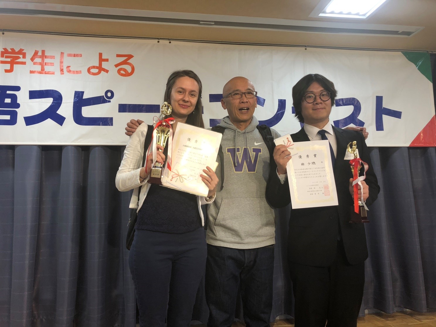 本学留学生が優秀賞に輝きました!「外国人留学生を支援する会」と「ふくやま国際交流協会」が主催した「第27回外国人留学生による日本語スピーチコンテスト」には本学から3名の留学生が出場し、うち2名が優秀賞を受賞しました。引率の趙准教授(国際センター)から当日のレポートが届きましたので、国際交流課長の坪根が報告いたします。
